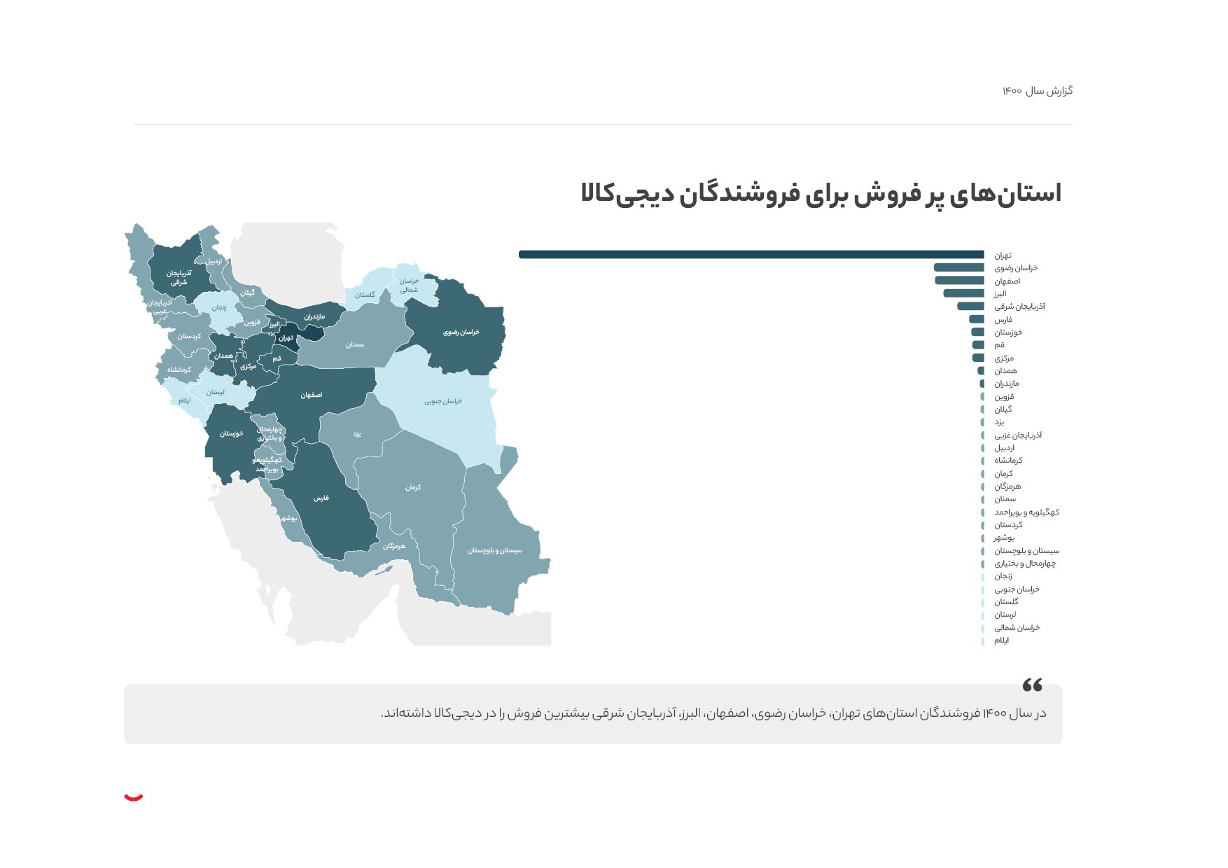 بعد از استان تهران که قاعدتا پرفروشترین استان برای فروشندگان دیجیکالاست در سال 1400 استان خراسان رضوی در رده دوم پرفروشترین استانها قرار دارد. دلیلش هم روشن است. شهر مشهد که زائرپذیرترین شهر ایران است در این استان قرار دارد و طبیعی است که خیلی از زائران وقتی از این شهر به شهر خودشان برمیگردند از طریق دیجیکالا محصولات و سوغاتیهای این شهر را خریداری میکنند و به همین ترتیب خیلی از مردم این استان و شهر مشهد خیلی از خریدهایشان را از دیجیکالا انجام میدهند. استان اصفهان هم سومین استان پرفروش در دیجیکالاست. آن هم به دلیل وجود صنایع دستی زیبای این استان که در مشتریان زیادی در سراسر ایران دارد. استانهای البرز و آذربایجان شرقی در رده بعدی این جدول قرار دارند.