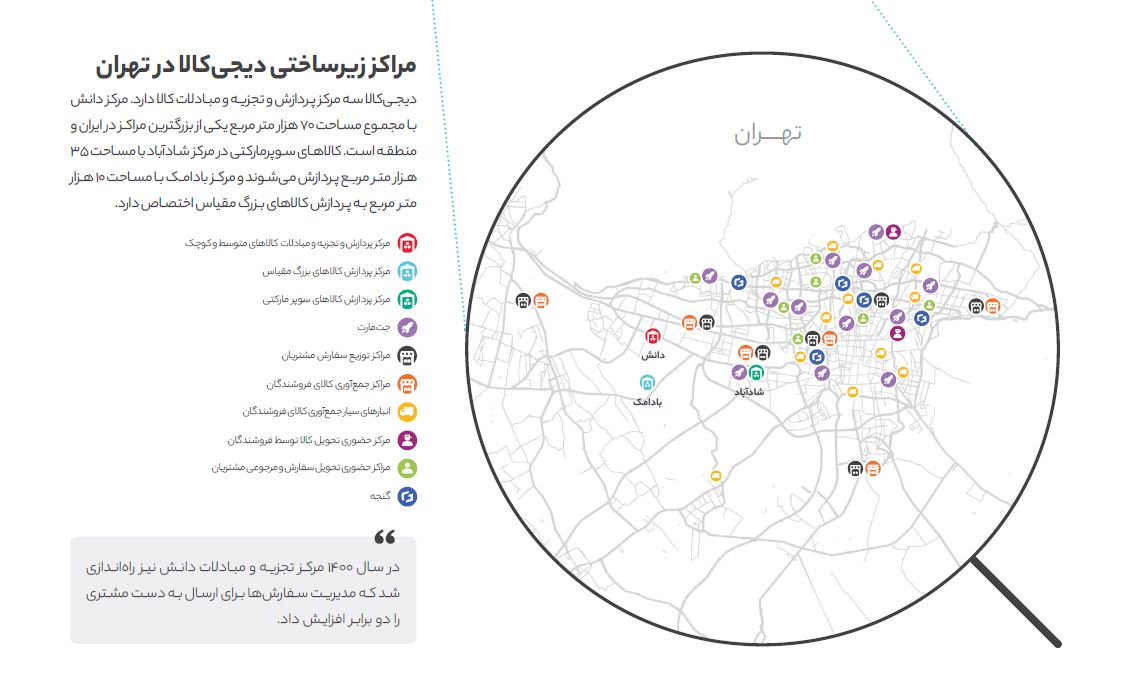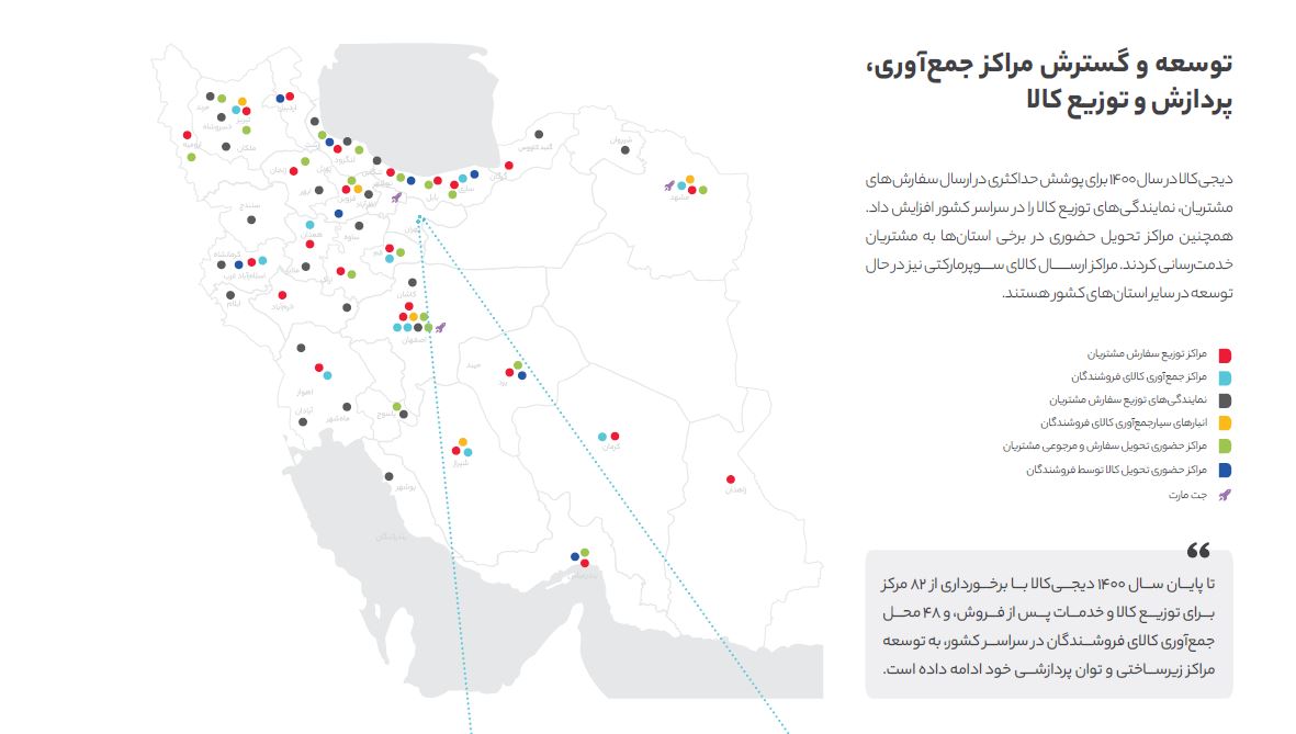 تصاویر زیر نقشه مراکز جمعآوری، پردازش و توزیع کالای دیجیکالا را نشان میدهد. بر این اساس دیجیکالا تقریبا در تمامی استانها یک مرکز توزیع کالا دارد و آن را پوشش میدهد.
