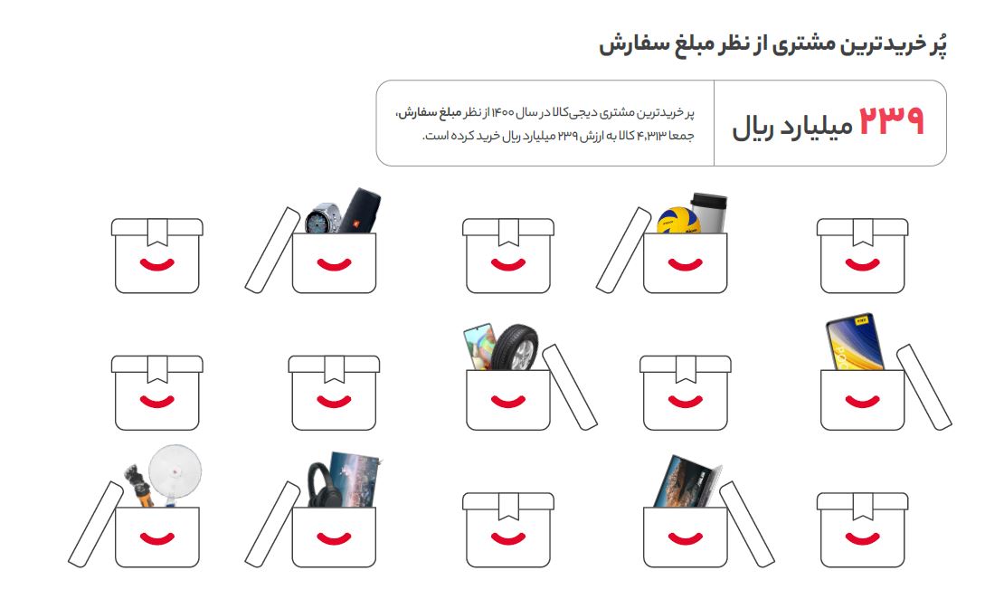از میان آمارهای جالب این گزارش میتوان به تصویر زیر اشاره کرد که در سال گذشته تنها یک مشتری دیجیکالا در حدود 24 میلیارد تومان از این فروشگاه خرید کرده است.