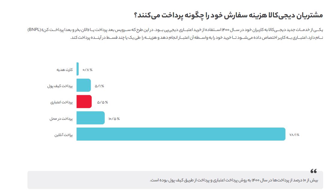 78 درصد از مشتریان دیجیکالا به صورت آنلاین و 10.5 درصد در محل و با دستگاه کارتخوان هزینه سفارش خود را پرداخت میکنند. پرداخت اعتباری توانسته به رقم 5.5 درصد برسد که در قالب سرویس BNPL یا “الان بخر و بعدا پرداخت کن” دیجیپی ارایه میشود. دیجیکالا با استفاده از سرویس دیجیپلاس که با پرداخت حق اشتراک، سرویس ویژه به کاربران ارایه میدهد، 2.3 میلیون کالا را رایگان برای مشتریان خود ارسال کرده و بیش از 800 هزار نفر مشترک آن هستند.