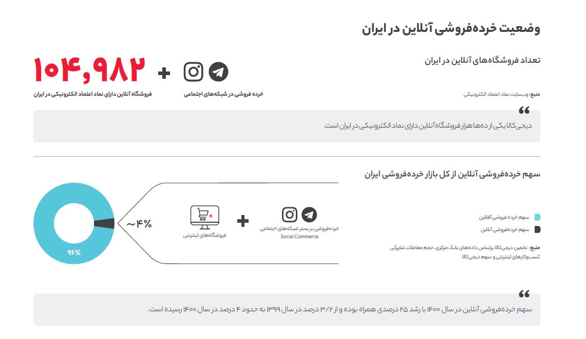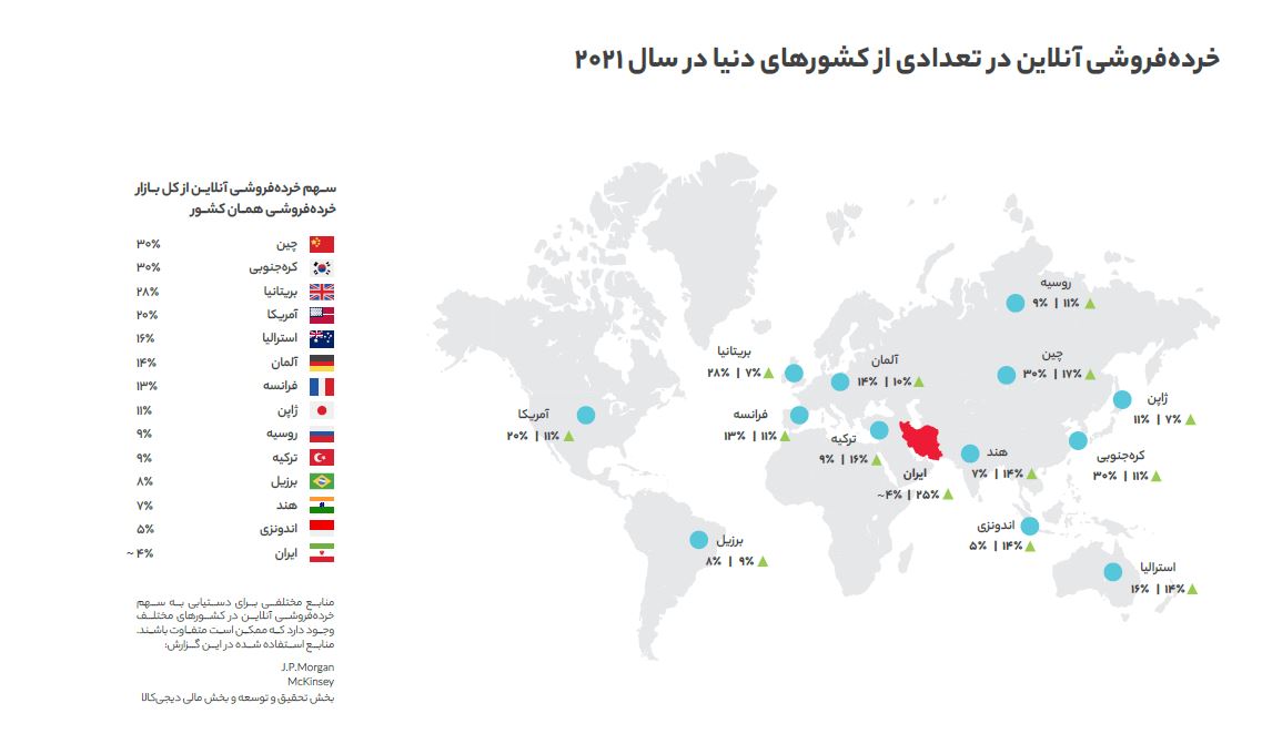 یکی از بخشهای مهم گزارش دیجیکالا نقشه زیر است که همچون گزارشهای پیشین حفظ و بهروز شده است. براساس اندازهگیریهای دیجیکالا سهم خرده فروشی آنلاین از کل بازار خرده فروشی در ایران به رقم حدودی 4 درصد رسیده است. این رقم برای سال 1399 عدد 3.2 درصد بود که رشد 25 درصدی را نشان میدهد. این رقم برای کشورهای همسایه همچون ترکیه 9 درصد است و نشان میدهد ایران راه زیادی برای رسیدن و بزرگتر شدن صنعت خردهفروشی آنلاین در پیش دارد.
