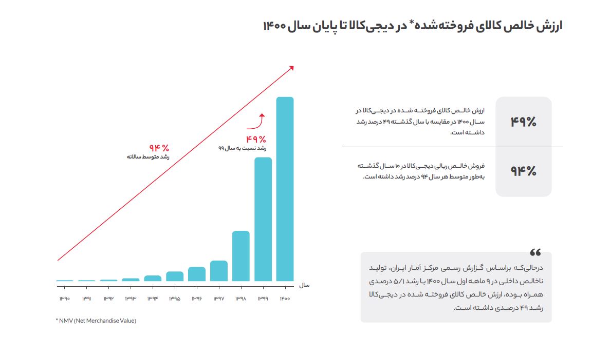 طبق رسم گزارشهای سالانه، دیجیکالا NMV فروش خود را منتشر کرده است. رشد متوسط سالانه دیجیکالا در یک دهه اخیر 94 درصد بوده و 1400 نسبت به 99 رقم 49 درصد رشد داشته است.