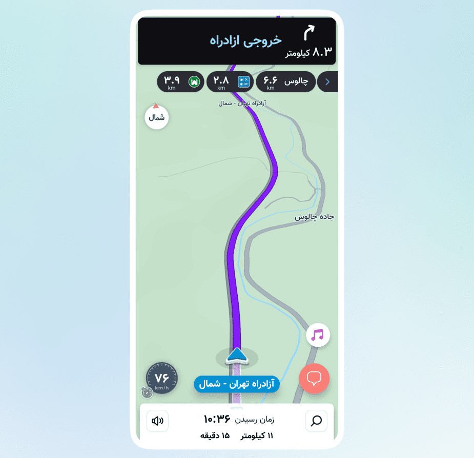 ویژگی «رادار جادهای» به صورت اتوماتیک و زمانی که مسیر کاربر در جاده و سفر بین شهری باشد، فعال میشود و در بالای صفحه قرار میگیرد تا اطلاعات مفیدی از مسیر را ارائه دهد.