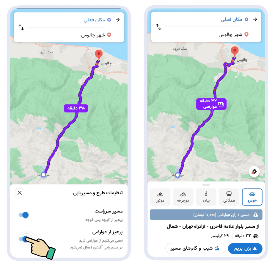 نمایش هزینه عوارضی و امکان تنظیم عدم عبور از عوارضی