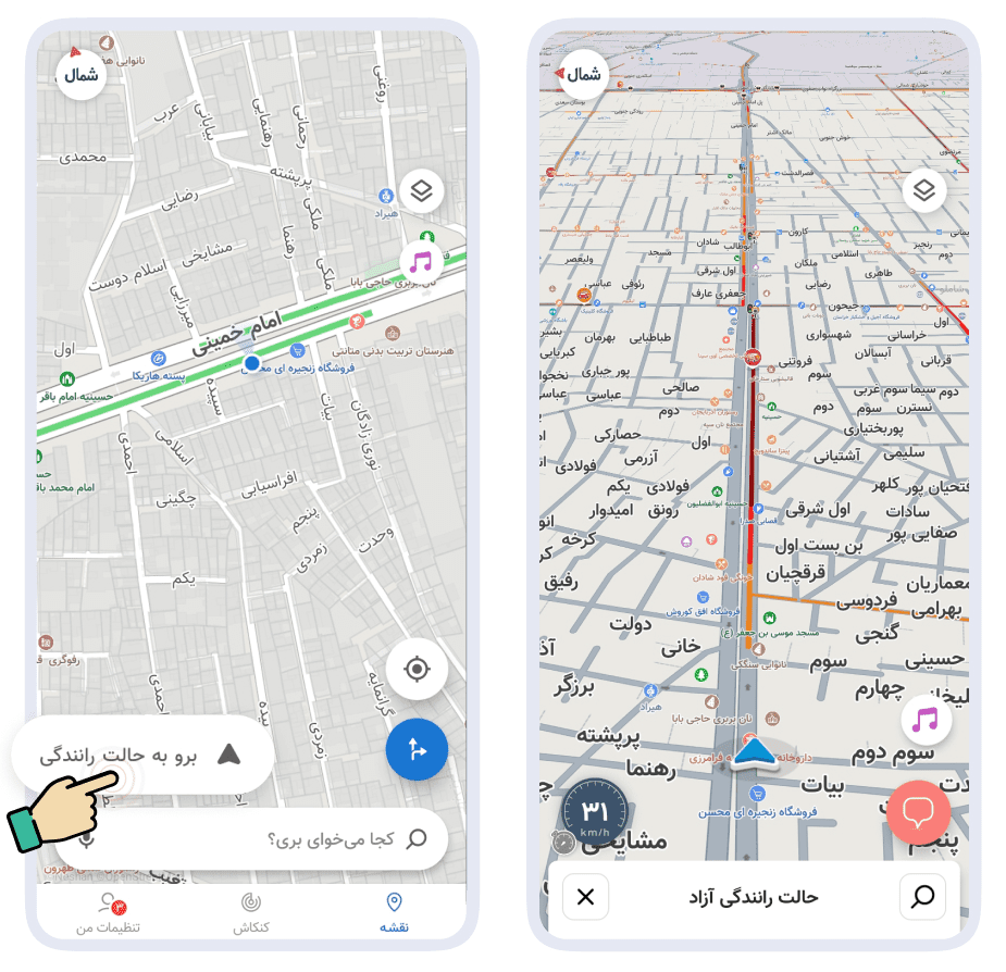 ویژگی رانندگی آزاد نشان این امکان را به کاربر میدهد که صرفا با باز کردن اپلیکیشن نشان و بدون درخواست مسیریابی، همچنان از وجود رویدادهای پیشرو نظیر پلیس و دوربین و تصادف و ترافیک در مسیر آگاهی یابد.