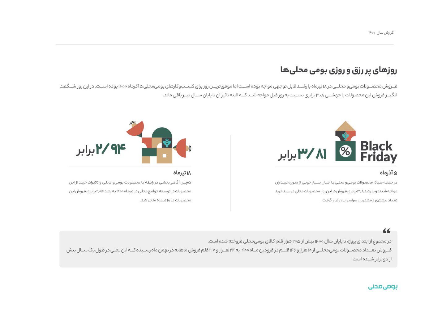 در 5 آذرماه 1400 و روز جمعه سیاه محصولات بومی محلی با اقبال بسیار خوبی از سوی خریداران مواجه شد و با رشد 3.81 برابری فروش در این روز، محصولات بومی محلی در سبد خرید تعداد بیشتری از مشتریان سراسر ایران قرار گرفت.