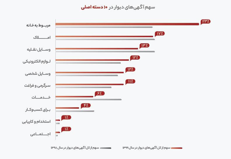 دیوار برای آگهیها دستهبندیهای متنوع و زیادی دارد. بر همین اساس در بخشی از گزارش دیوار آمار سهم آگهیها آمده است که مطابق تصویر زیر نشان میدهد چه مواردی بیشترین تعداد آگهی را دارند. وسایل مربوط به خانه با 23 درصد در صدر و سپس آگهیهای املاک با 17 درصد و نیز خودرو با 13 درصد سه دسته پرآگهی در دیوار بودهاند. نکته قابل توجه این است که 1 درصد از آگهیهای دیوار مربوط با استخدام و کاریابی بوده است که نشان میدهد کسبوکارهای زیادی از این پلتفرم برای یافتن نیرو استفاده میکنند. دیوار نیز ابزاری به این منظور برای منابع انسانی تدارک دیده و در صفحات آتی گزارش اطلاعات بیشتری از آن منتشر کرده است.