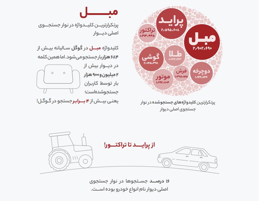 در قسمتی از گزارش دیوار آمده است که پرتکرارترین کلیدواژه در نوار جستجوی این پلتفرم “مبل”، “پراید” و سپس “گوشی” بوده است. دیوار میگوید واژه مبل سالانه در گوگل 684 هزار بار جستجو میشود، اما در این پلتفرم 4 برابر گوگل یعنی 2 میلیون و 900 هزار بار جستجو شده است. به نظر میرسد این آمار بخشی از پازل دادههای ارزشمند دیوار برای کسبوکارها باشد که در ابتدای مطلب به آن اشاره کردیم.