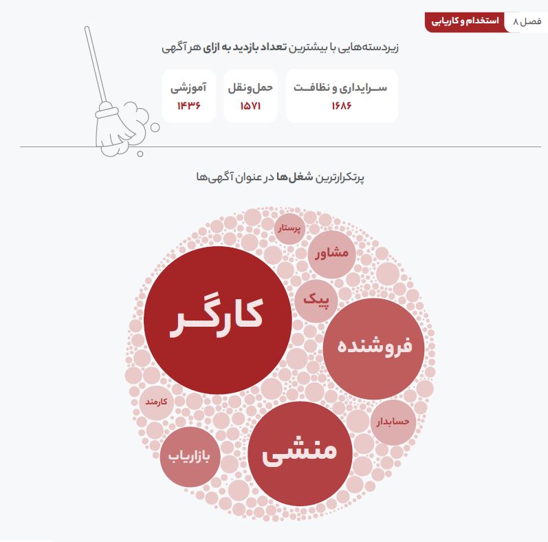 یکی از دستههایی که دیوار اخیرا توجه زیادی به آن نشان داده “کاریابی” است. در سال 99 تعداد 1.6 میلیون آگهی در دسته استخدام و کاریابی در دیوار منتشر شده و این پلتفرم تخمین میزند که 605 هزار استخدام از طریق آن انجام شده است. دستههای شغلی زیر به عنوان پرتکرارترین مشاغل آگهیها در دیوار ثبت شدهاند. تصویر زیر نشان میدهد دیوار بخش شغلهای خدماتی را هدف گرفته و تعداد زیادی آگهی و استخدام از طریق آن در این دستهها رخ داده است. به نظر میرسد پلتفرمهای تخصصی کاریابی نظیر ایران تلنت یا جابینجا کماکان در صدر رجوع برای منابع انسانی شرکتها به منظور یافتن نیروی انسانی متخصص قرار دارند.