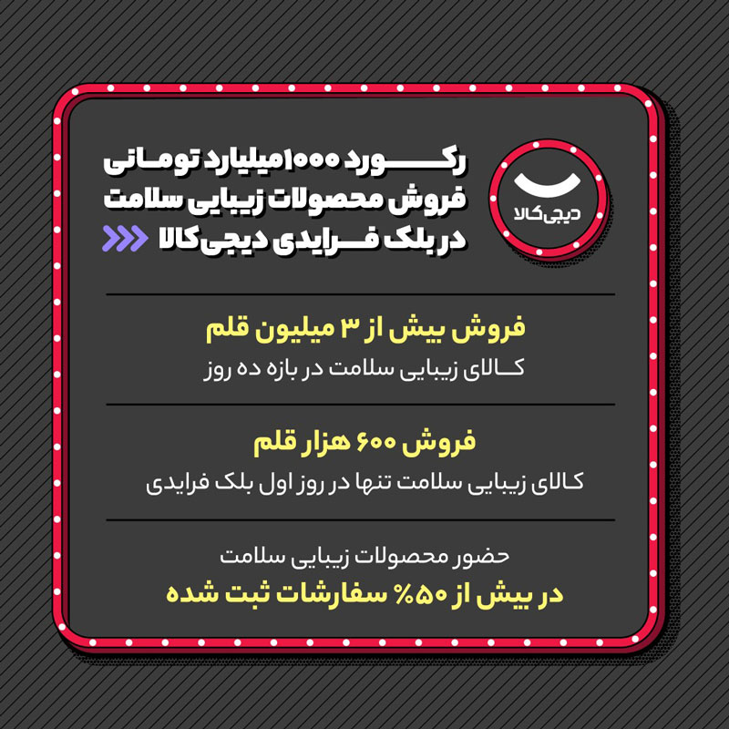دیجی‌کالا به‌عنوان بزرگترین فروشگاه اینترنتی ایران در ذهن مصرف‌کننده ایرانی با «کالای دیجیتال» و گجت‌های الکترونیکی  گره خورده است اما حالا طبق داده‌های منتشر شده، دیجی‌کالا در بازه ۱۰ روزه فروش ویژه خود در ایام بلک فرایدی، موفق به ثبت فروش ۱۰۰۰ میلیارد تومانی (یک همت) تنها در دسته زیبایی و سلامت شده است. ناگفته نماند در همین بازه زمانی بیش ۳ میلیون قلم کالای لوازم آرایشی- بهداشتی نیز به فروش رفته است. نکته قابل تامل اینجاست که تنها در روز اول بلک فرایدی، بیش از ۶۰۰ هزار قلم کالای آرایشی و بهداشتی خریداری شد که یک رکورد محسوب می‌شود.