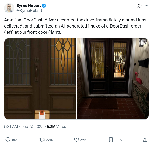 ماجرا زمانی به رسانهها کشیده شد که «برن هوبارت» (Byrne Hobart)، نویسنده مشهور حوزه فناوری و مالی ساکن شهر آستین، تجربه عجیب خود را در شبکه اجتماعی ایکس (توییتر سابق) به اشتراک گذاشت. هوبارت اعلام کرد که پیک پس از پذیرش سفارش، بلافاصله آن را به عنوان «تحویل داده شده» علامتگذاری کرد، اما تصویری که به عنوان مدرک تحویل در اپلیکیشن آپلود شده بود، یک تصویر ساخته شده توسط هوش مصنوعی بود.