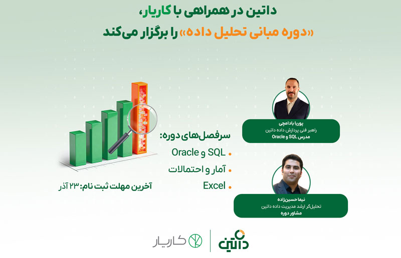 دوره «مبانی تحلیل داده» داتین و کاریار، از هفته اول دی تا نیمه اسفندماه برگزار میشود. در این دوره، مباحث پایهای همچون SQL و Oracle، آمار و احتمالات و اکسل پوشش داده میشود تا مهارتآموزان بتوانند مسیر ورود به دنیای تحلیل داده را به صورت اصولی آغاز و تجربهای نزدیک به فضای حرفهای کسب کنند.
