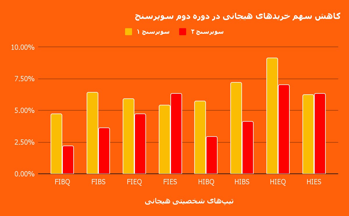 بیشترین کاهش در تیپ شخصیتی FIBQ (لذتجو، هیجانی، برند وفادار و کیفیتمحور) اتفاق افتاده است. تاکیدی بر کاهش سهم خریدارارن هیجانی، برند وفادار و کیفیتمحور.