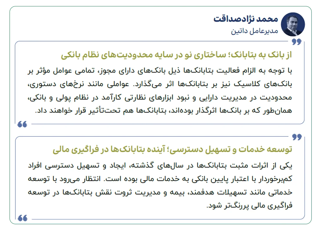 محم نژادصداقت، مدیرعامل داتین، در بخشی از این گزارش اشاره میکند که با توجه به الزام فعالیت بتابانکها ذیل بانکهای دارای مجوز، تمامی عوامل مؤثر بر بانکهای کلاسیک نیز بر بتابانکها اثر میگذارد. با این حال، یکی از اثرات مثبت بتابانکها در سالهای گذشته، فراهم کردن و تسهیل دسترسی افراد کمبرخوردار و کسانی با اعتبار پایین بانکی به خدمات مالی بوده است که انتظار میرود نقش بتابانکها در توسعه فراگیری مالی بیش از پیش پررنگ شود.