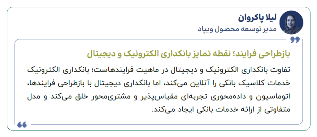 لیلا پاکرواننژاد، مدیر توسعه محصول ویپاد در بخشی از گزارش، به تفاوت بنیادین میان «الکترونیکیسازی» و «دیجیتالسازی» اشاره میکند. به باور او، هنر ویپاد این نبوده که خدمات سنتی را صرفاً آنلاین کند بلکه با بازطراحی فرایندها، تجربه مشتری را دگرگون کرده است.