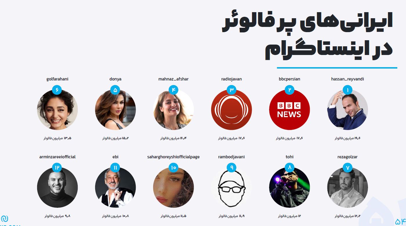 پس از داده‌های خارجی این گزارش به وضعیت ایران پرداخته است. پیج‌های زیر بیشتری تعداد فالوور را در میان ایرانیان دارد.