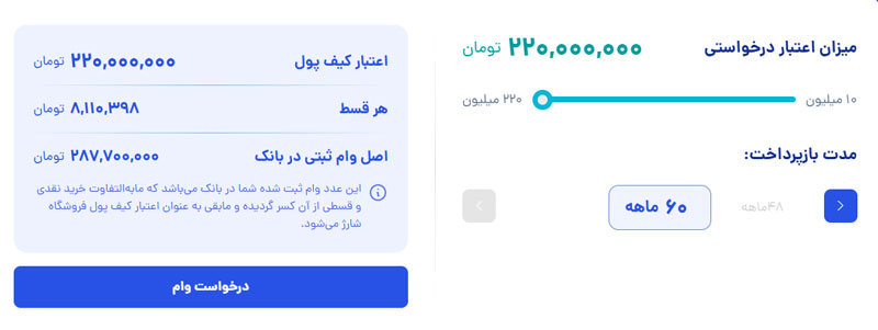در بخش سمت راست ماشینحساب، کاربر میتواند میزان اعتبار درخواستی و مدت بازپرداخت را انتخاب کند. سپس در سمت چپ ماشینحساب، اطلاعات مربوط به اعتبار کیف پول، میزان هر قسط و اصل وام ثبتی در بانک نمایش داده میشود.