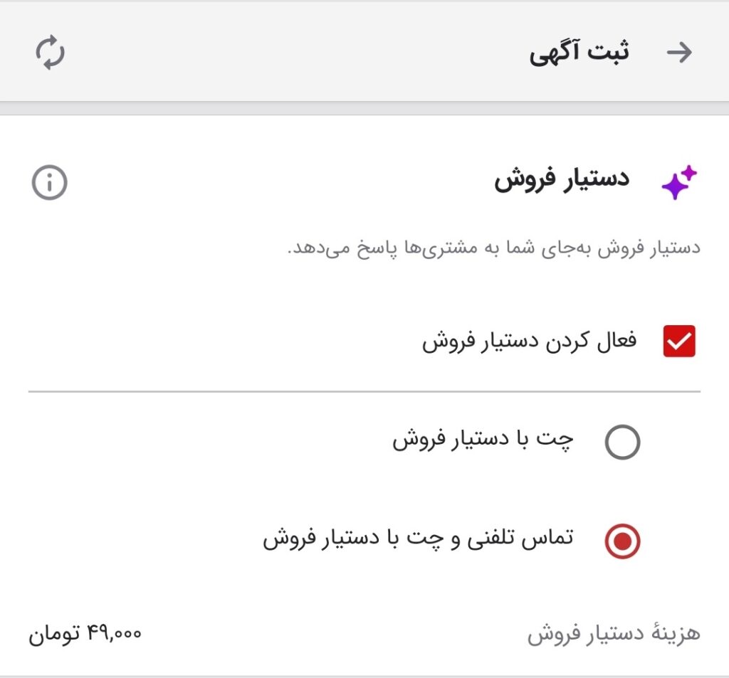 برای فعالسازی دستیار فروش، هنگام ثبت آگهی گزینه «فعال کردن دستیار فروش» را انتخاب کرده و یکی از حالتهای «چت با دستیار فروش» یا «چت و تماس تلفنی با دستیار فروش» را مشخص کنید.