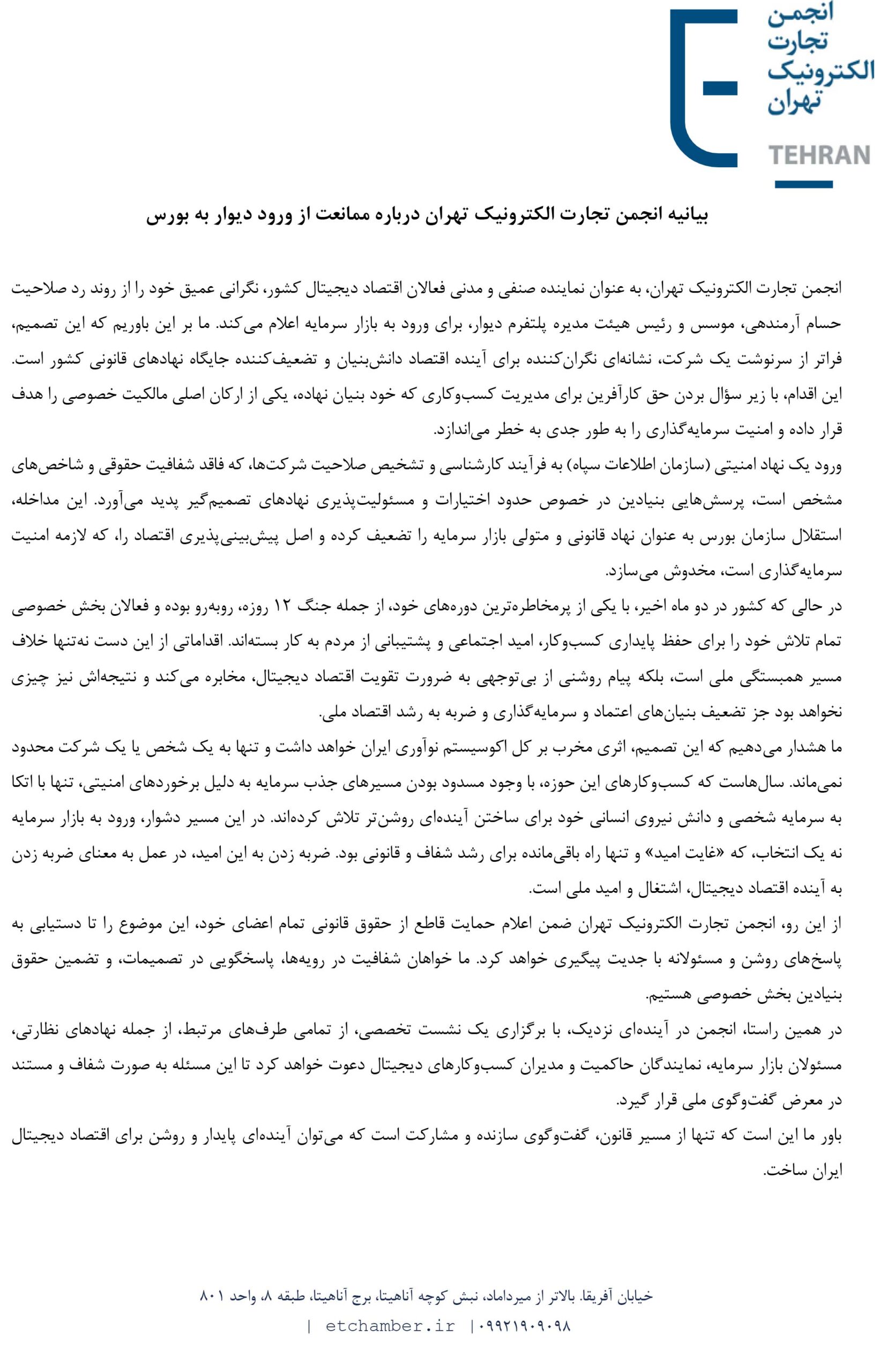 در این بیانیه انجمن نگرانی عمیق خود را از فرآیندی اعلام کرد که منجر به ممانعت از عرضه سهام یکی از بزرگترین استارتاپهای کشور در بورس شده است. به باور این انجمن، چنین اقدامی با زیر سوال بردن حق یک کارآفرین برای مدیریت کسبوکاری که خود بنیان نهاده، یکی از پایههای اساسی «مالکیت خصوصی» را هدف قرار داده است.
