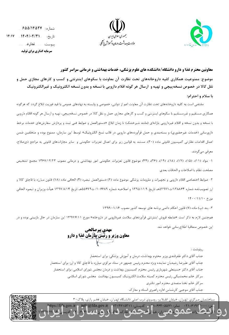 بر اساس نامهای که در تاریخ ۳۱ اردیبهشت ۱۴۰۴ از سوی دکتر مهدی پیرصالحی، معاون وزیر و رییس سازمان غذا و دارو به معاونان غذا و داروی دانشگاهها و دانشکدههای علوم پزشکی سراسر کشور ابلاغ شده است، داروخانههای دولتی، خصوصی و وابسته به نهادهای عمومی موظفند فورا از هرگونه همکاری با پلتفرمهای اینترنتی و کسبوکارهای مجازی حملونقل کالا در زمینه نسخهپیچی و ارسال هر نوع اقلام دارویی (با نسخه و بدون نسخه، الکترونیک و غیرالکترونیک) و اقلام غیردارویی یارانهای مانند شیرخشک، خودداری کنند.