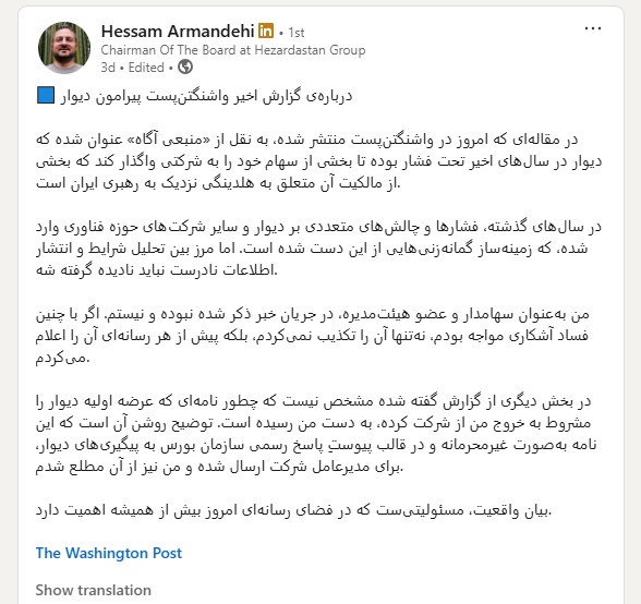 او همچنین در بخشی دیگر به شفافسازی درباره نامهای پرداخت که عرضه اولیه سهام دیوار در بورس را به خروج او از شرکت مشروط کرده بود.