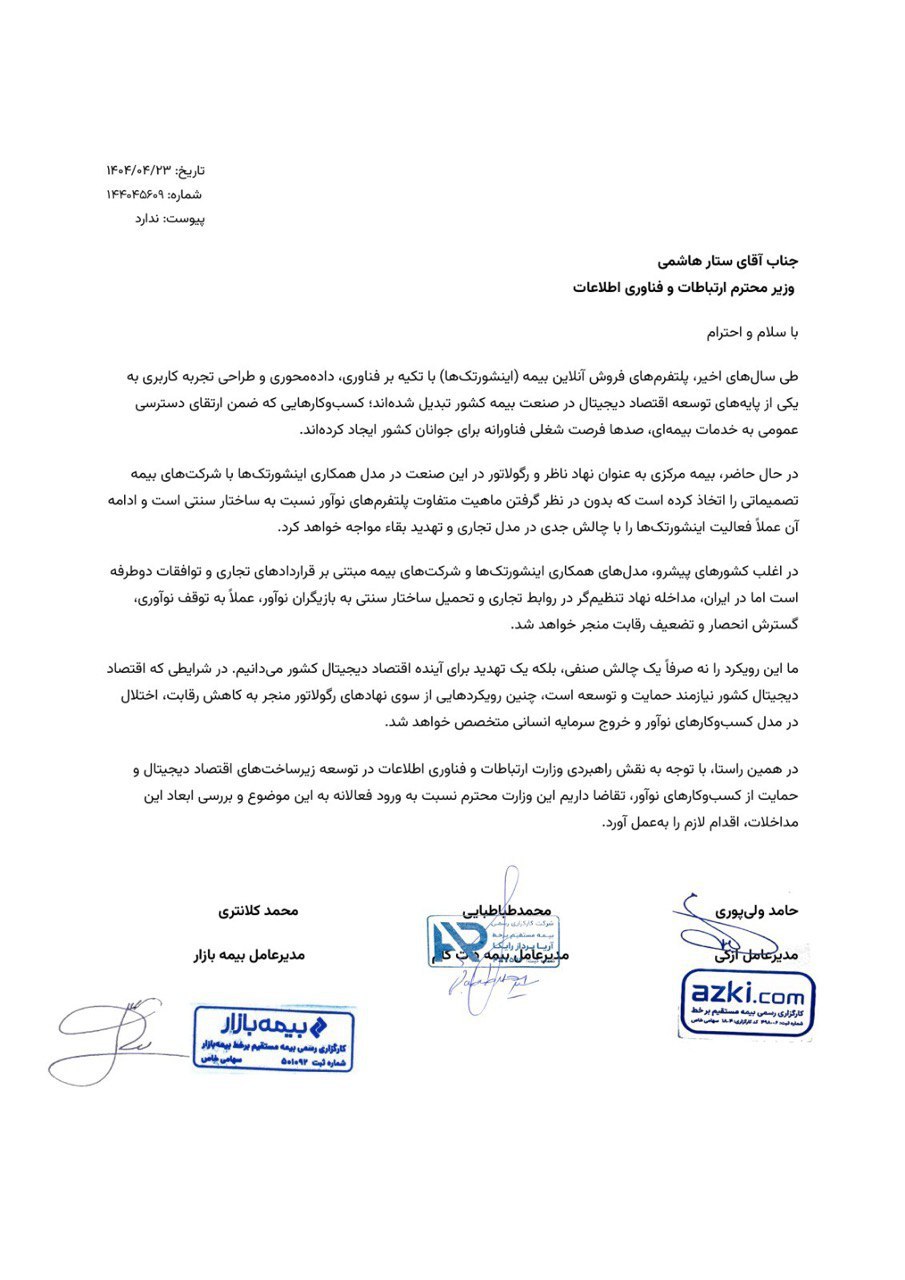 در متن این نامه به صراحت بیان شده است که بیمه مرکزی به عنوان نهاد ناظر، همزمان در جایگاه «رقیب» پلتفرمهای خصوصی قرار گرفته و با تصمیمات خود، مدلهای کسبوکار نوآور و مبتنی بر فناوری را به چالش کشیده است. نویسندگان نامه معتقدند رویکرد بیمه مرکزی در «مداخله در روابط تجاری» و «تحمیل ساختار سنتی به بازیگران نوآور»، عملا به تضعیف رقابت و گسترش انحصار در بازار منجر خواهد شد و بقای کسبوکارهایشان را تهدید میکند.
