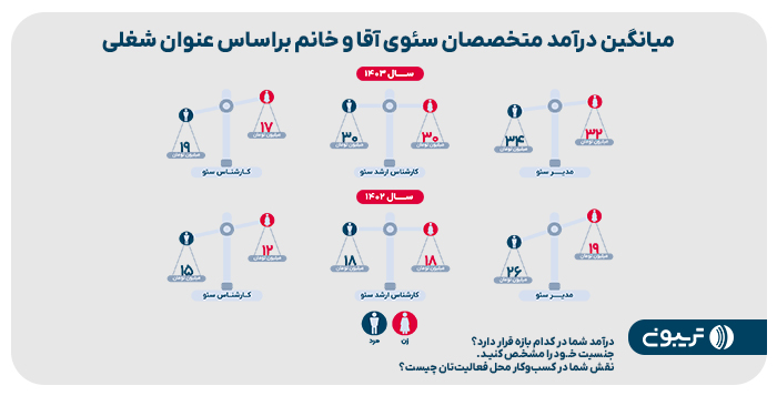میانگین درآمد ماهانه متخصصان سئو در سال ۱۴۰۳ برابر ۲۹میلیون تومان بوده است. نزدیک به ۲۰درصد متخصصان سئو در سال ۱۴۰۳ بالای ۵۰میلیون تومان در ماه درآمد داشتهاند. در سال گذشته، میانگین درآمد ماهانه مدیران سئوی آقا و خانم بهترتیب ۳۴ و ۳۲میلیون تومان، میانگین درآمد ماهانه کارشناسان ارشد سئوی آقا و خانم بهشکل یکسان ۳۰میلیون تومان و میانگین درآمد ماهانه کارشناسان سئوی آقا و خانم ۱۹ و ۱۷میلیون تومان بوده است. همچنین، میانگین درآمد متخصصان سئوی یکشغله، دوشغله و سهشغله در سال ۱۴۰۳ بهترتیب ۲۷، ۲۹ و ۳۶میلیون تومان بوده است.