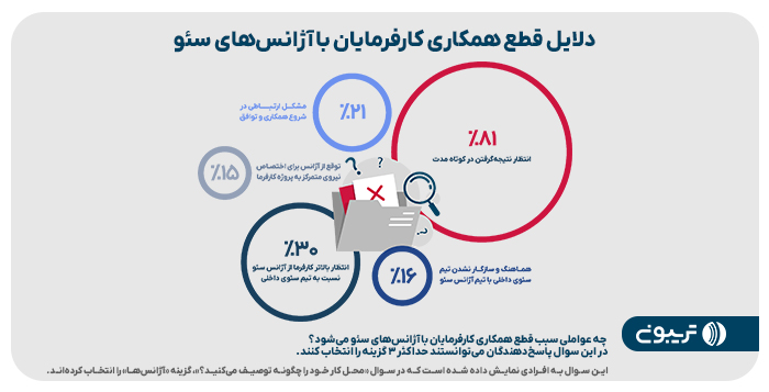 ۵۱درصد از متخصصان سئوی شاغل در آژانسها و فریلنسرها و مشاوران سئو اعلام کردهاند که در سال ۱۴۰۳ بودجه کارفرمایان با افزایش همراه بوده است. در سال ۱۴۰۳ بزرگترین دلیل قطع همکاری کارفرمایان با آژانسهای سئو «انتظار نتیجه گرفتن در کوتاه مدت» و بزرگترین انتظار کارفرمایان از متخصصان سئو «افزایش فروش» بوده است.