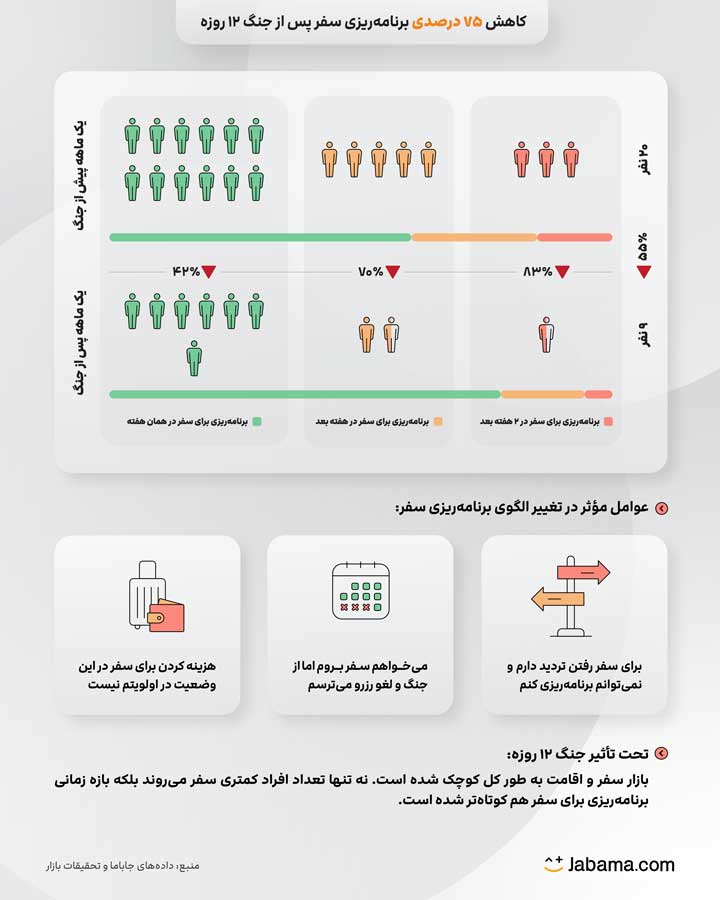 تحقیقات بازار انجامشده توسط پلتفرم «جاباما» نشان میدهد که جنگ ۱۲ روزه اخیر، تاثیر مستقیم و قابل توجهی بر صنعت سفر و اقامت کشور گذاشته است. مهمترین یافته این گزارش، افت شدید ۷۵ درصدی در «برنامهریزی برای سفر» در یک ماه پس از این رویداد است که زنگ خطری جدی برای فعالان این حوزه محسوب میشود.