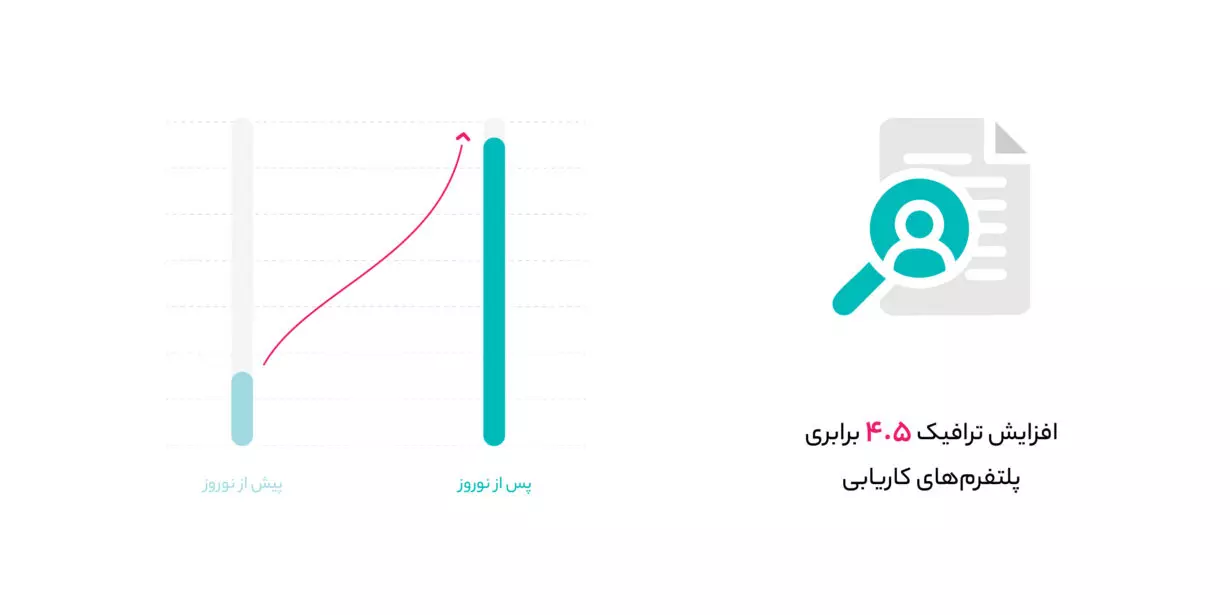 ترکیب ترافیک پلتفرمهای کاریابی نشان میدهد، کاربران پس از تعطیلات نوروزی و بهمحض بازگشت به روال معمول کاری، به جستوجوی کار برای سال جدید رفتهاند. بهطوری که ترافیک این پلتفرمها به ۴.۵ برابر نسبت به ترافیک معمول افزایش یافته است.
