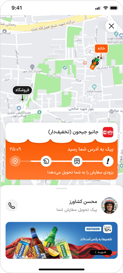 - صفحه پیگیری سفارش (Order Tracking): این صفحه پراهمیت به صورت شفافتر و منظمتر بازطراحی شده و تمامی اطلاعات کلیدی مانند وضعیت پیک، فروشگاه و مراحل سفارش را به کاربر نشان میدهد، بهعلاوه یک ایستر اِگ جذاب هم به آن اضافه شده تا انتظار کاربر را لذتبخشتر کند.