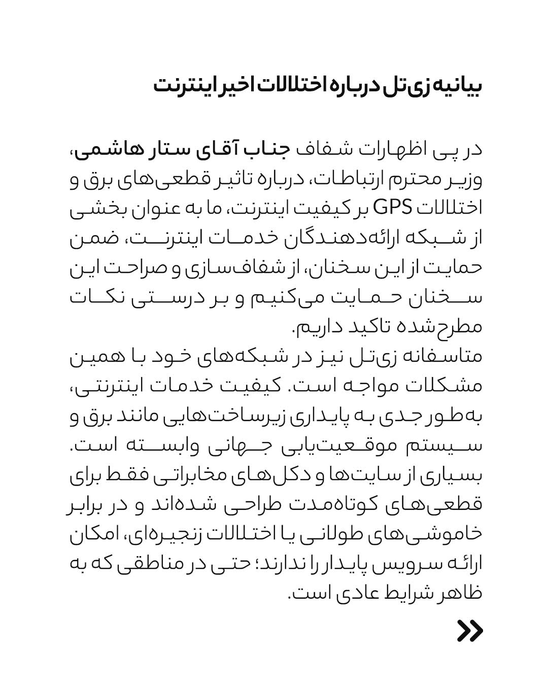 این شرکت ضمن پوزش رسمی از کاربران خود به دلیل عدم امکان ارائه خدمات کامل و بینقص در «شرایط غیرعادی» فعلی، اعلام کرد که بخشی از مشکلات خارج از کنترل این اپراتور است. با این حال، «زیتل» اطمینان داد که تیمهای فنی آن به صورت شبانهروزی در تلاش هستند تا پایداری شبکه را تا حد ممکن حفظ کنند.